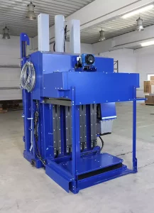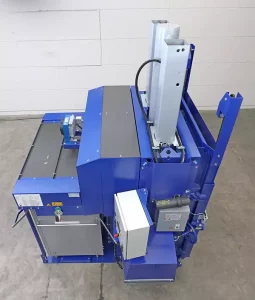The base of the cart is automatically raised forcing the cardboard into a set of rotors that feed it into the bale chamber for compaction. After repeated fills (typically around 35 carts) the bale full light comes on telling the operator to tie off and eject the bale in the usual “Strautmann” way.